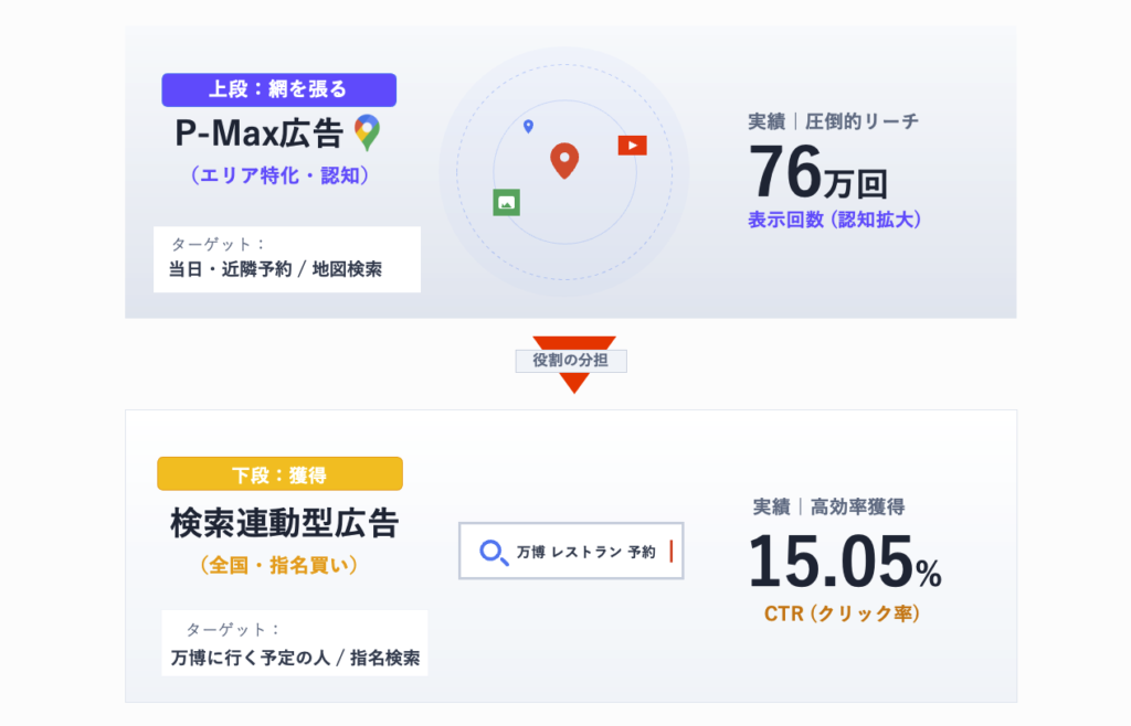 今回の成功の最大の要因は、ターゲットの心理状態に合わせて「検索連動型広告」と「P-Max広告」の役割を明確に分けたことにあります。