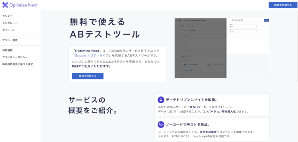 Googleオプティマイズの「精神的後継者」とも呼ばれるツールです。GoogleオプティマイズにUI/UXを意図的に似せて開発されており、乗り換えの学習コストが非常に低いのが最大の特長です。訪問者数やテスト回数に制限なく、基本的なランディングページのABテスト機能をすべて無料で利用できます。