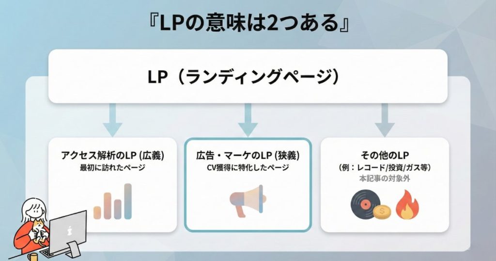 | 広義のLP | ユーザーが最初に訪れたページ全般 | アクセス解析(Google Analyticsなど)で「ランディングページ」と表示される指標 |