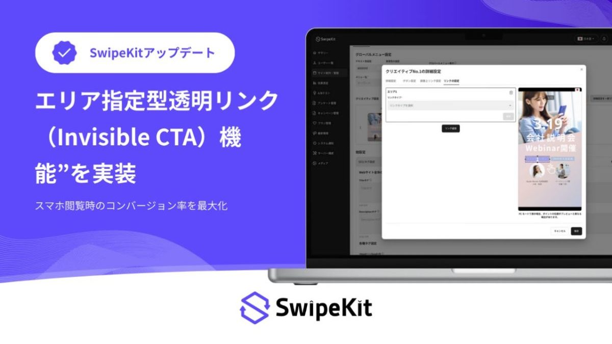 株式会社ベクトル(本社:東京都港区、代表取締役会長兼社長CEO:西江 肇司、東証プライム:6058)の子会社で、SaaS事業及びデジタルマーケティング支援事業を展開する株式会社トライハッチ(東京都新宿区、代表取締役社長、武藤 尭行、以下「当社」)は、スワイプ操作で直感的にLP(ランディングページ)を制作・分析できるツール「SwipeKit(スワイプキット)」において、新たに「エリア指定型透明リンク(Invisible CTA)」機能を実装いたしました。