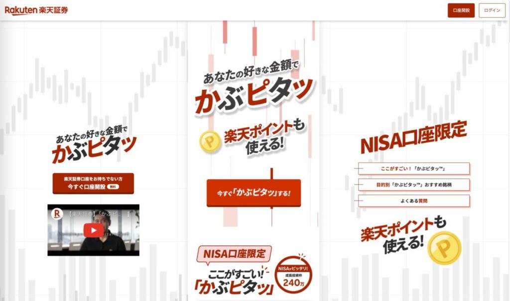 実際に、スワイプ型看板LPを利用している「楽天証券のかぶピタッ」のサービスでは、下記のようにPC表示では訴求力を強く行う看板型で表示し、スマートフォン表示では、中央のコンテンツのみ表示されるスワイプ型と切り分けています。